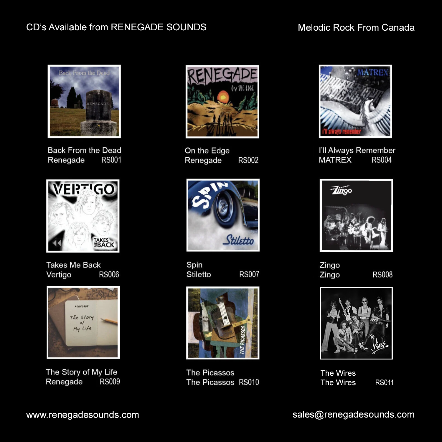Noticing there was a demand for this type of melodic rock, the label followed up with On the Edge also by Renegade. This led to a search of Vancouver studios for other great AOR rock bands from the 80’s and releases by Matrex, Vertigo and Stiletto followed. A very special release followed called Zingo, the original young band featuring Bryan Adams’ guitarist virtuoso Keith Scott, who also played on the next release by Renegade “The Story of My Life”. A newer addition to the label, The Picassos, a band based in both Zurich and Vancouver.